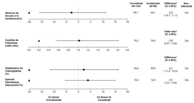 La tolérance de crovalimab chez les patients atteints d’HPN a été évaluée dans trois études de phase III, COMMODORE 2 (BO42162), COMMODORE 3 (YO42311) et COMMODORE 1 (BO42161), ainsi que dans une étude de phase I/II, COMPOSER (BP39144).